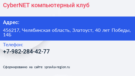 CyberNET, компьютерный клуб по адресу 456217, Челябинская область, Златоуст, 40 лет Победы, 14Б в дальнейшем Организация, размещена в следующих категориях: