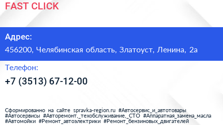 FAST CLICK по адресу 456200, Челябинская область, Златоуст, Ленина, 2а в дальнейшем Организация, размещена в следующих категориях: