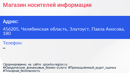 Магазин носителей информации по адресу 456205, Челябинская область, Златоуст, Павла Аносова, 180 в дальнейшем Организация, размещена в следующих категориях: