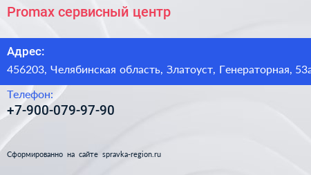 Promax, сервисный центр по адресу 456203, Челябинская область, Златоуст, Генераторная, 53а в дальнейшем Организация, размещена в следующих категориях: