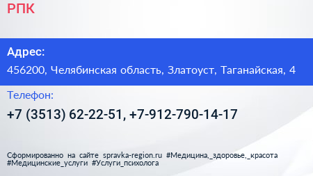 РПК по адресу 456200, Челябинская область, Златоуст, Таганайская, 4 в дальнейшем Организация, размещена в следующих категориях: