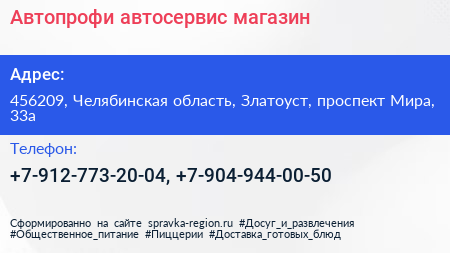 Автопрофи, автосервис-магазин по адресу 456209, Челябинская область, Златоуст, проспект Мира, 33а в дальнейшем Организация, размещена в следующих категориях: