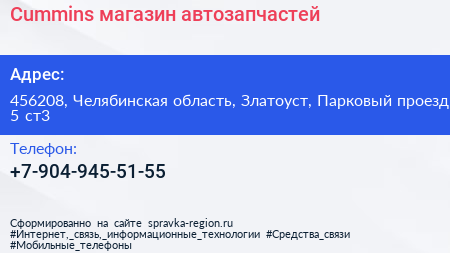Cummins, магазин автозапчастей по адресу 456208, Челябинская область, Златоуст, Парковый проезд, 5 ст3 в дальнейшем Организация, размещена в следующих категориях:
