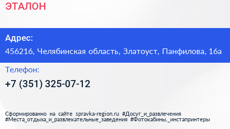 ЭТАЛОН по адресу 456216, Челябинская область, Златоуст, Панфилова, 16а в дальнейшем Организация, размещена в следующих категориях: