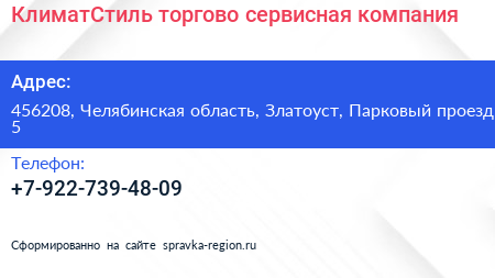КлиматСтиль, торгово-сервисная компания по адресу 456208, Челябинская область, Златоуст, Парковый проезд, 5 в дальнейшем Организация, размещена в следующих категориях: