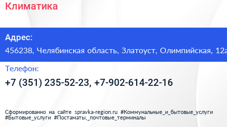 Климатика по адресу 456238, Челябинская область, Златоуст, Олимпийская, 12а в дальнейшем Организация, размещена в следующих категориях: