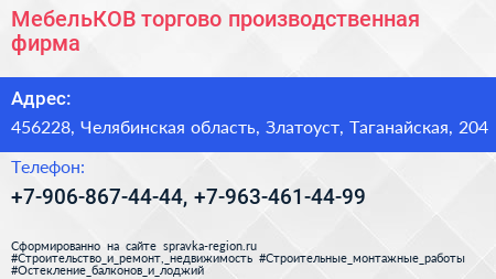 МебельКОВ, торгово-производственная фирма по адресу 456228, Челябинская область, Златоуст, Таганайская, 204 в дальнейшем Организация, размещена в следующих категориях: