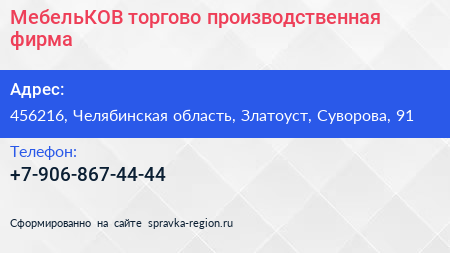 МебельКОВ, торгово-производственная фирма по адресу 456216, Челябинская область, Златоуст, Суворова, 91 в дальнейшем Организация, размещена в следующих категориях: