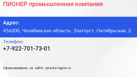 ПИОНЕР, промышленная компания по адресу 456200, Челябинская область, Златоуст, Октябрьская, 2 в дальнейшем Организация, размещена в следующих категориях:
