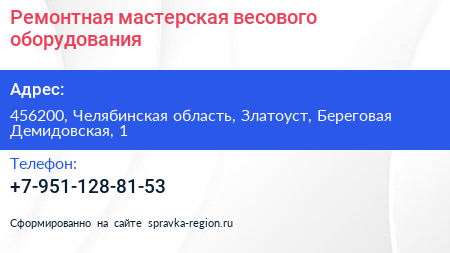 Ремонтная мастерская весового оборудования по адресу 456200, Челябинская область, Златоуст, Береговая Демидовская, 1 в дальнейшем Организация, размещена в следующих категориях: