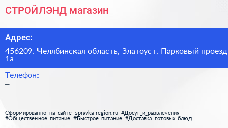 СТРОЙЛЭНД, магазин по адресу 456209, Челябинская область, Златоуст, Парковый проезд, 1а в дальнейшем Организация, размещена в следующих категориях: