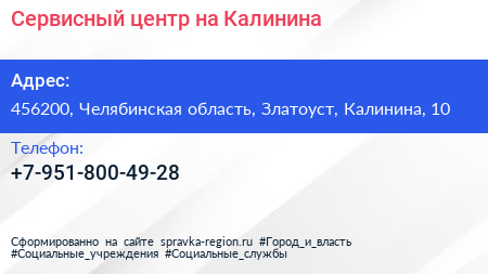 Сервисный центр на Калинина по адресу 456200, Челябинская область, Златоуст, Калинина, 10 в дальнейшем Организация, размещена в следующих категориях:
