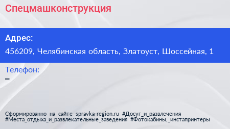 Спецмашконструкция по адресу 456209, Челябинская область, Златоуст, Шоссейная, 1 в дальнейшем Организация, размещена в следующих категориях: