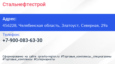 Стальнефтестрой по адресу 456228, Челябинская область, Златоуст, Северная, 29а в дальнейшем Организация, размещена в следующих категориях: