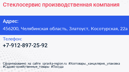 Стеклосервис, производственная компания по адресу 456200, Челябинская область, Златоуст, Косотурская, 22а в дальнейшем Организация, размещена в следующих категориях: