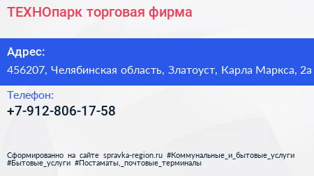ТЕХНОпарк, торговая фирма по адресу 456207, Челябинская область, Златоуст, Карла Маркса, 2а в дальнейшем Организация, размещена в следующих категориях: