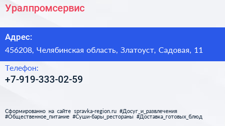 Уралпромсервис по адресу 456208, Челябинская область, Златоуст, Садовая, 11 в дальнейшем Организация, размещена в следующих категориях:
