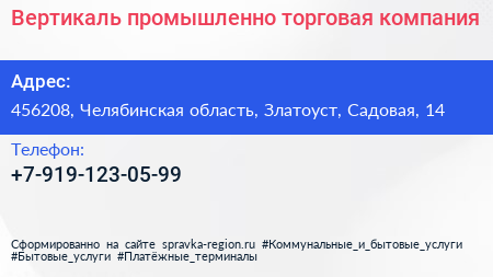 Вертикаль, промышленно-торговая компания по адресу 456208, Челябинская область, Златоуст, Садовая, 14 в дальнейшем Организация, размещена в следующих категориях: