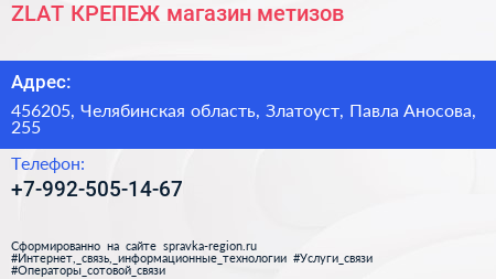 ZLAT КРЕПЕЖ, магазин метизов по адресу 456205, Челябинская область, Златоуст, Павла Аносова, 255 в дальнейшем Организация, размещена в следующих категориях: