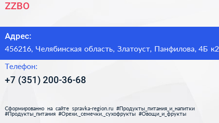 ZZBO по адресу 456216, Челябинская область, Златоуст, Панфилова, 4Б к2 в дальнейшем Организация, размещена в следующих категориях: