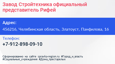 Завод Стройтехника, официальный представитель Рифей по адресу 456216, Челябинская область, Златоуст, Панфилова, 16 в дальнейшем Организация, размещена в следующих категориях: