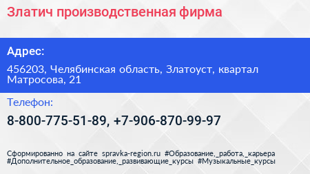 Златич, производственная фирма по адресу 456203, Челябинская область, Златоуст, квартал Матросова, 21 в дальнейшем Организация, размещена в следующих категориях: