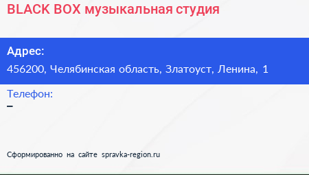 BLACK BOX, музыкальная студия по адресу 456200, Челябинская область, Златоуст, Ленина, 1 в дальнейшем Организация, размещена в следующих категориях: