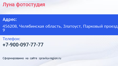 Луна, фотостудия по адресу 456208, Челябинская область, Златоуст, Парковый проезд, 9 в дальнейшем Организация, размещена в следующих категориях: