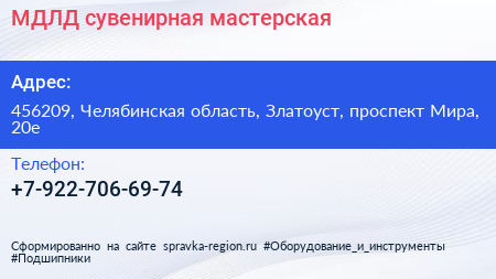 МДЛД, сувенирная мастерская по адресу 456209, Челябинская область, Златоуст, проспект Мира, 20е в дальнейшем Организация, размещена в следующих категориях: