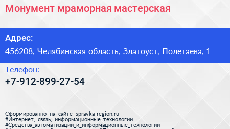 Монумент, мраморная мастерская по адресу 456208, Челябинская область, Златоуст, Полетаева, 1 в дальнейшем Организация, размещена в следующих категориях: