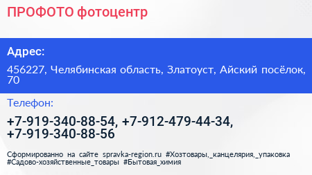 ПРОФОТО, фотоцентр по адресу 456227, Челябинская область, Златоуст, Айский посёлок, 70 в дальнейшем Организация, размещена в следующих категориях: