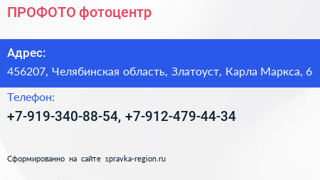 ПРОФОТО, фотоцентр по адресу 456207, Челябинская область, Златоуст, Карла Маркса, 6 в дальнейшем Организация, размещена в следующих категориях: