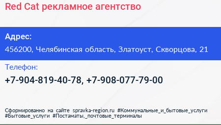 Red Cat, рекламное агентство по адресу 456200, Челябинская область, Златоуст, Скворцова, 21 в дальнейшем Организация, размещена в следующих категориях: