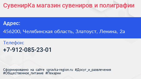 СувенирКа, магазин сувениров и полиграфии по адресу 456200, Челябинская область, Златоуст, Ленина, 2а в дальнейшем Организация, размещена в следующих категориях: