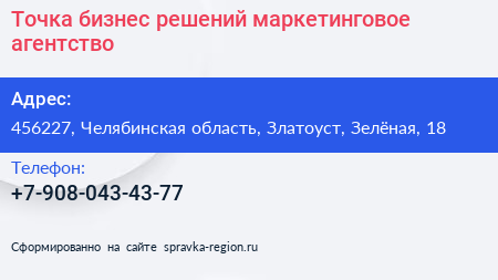 Точка бизнес решений, маркетинговое агентство по адресу 456227, Челябинская область, Златоуст, Зелёная, 18 в дальнейшем Организация, размещена в следующих категориях:
