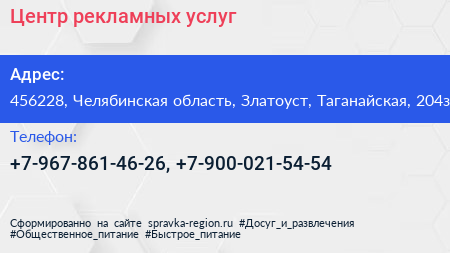 Центр рекламных услуг по адресу 456228, Челябинская область, Златоуст, Таганайская, 204з в дальнейшем Организация, размещена в следующих категориях: