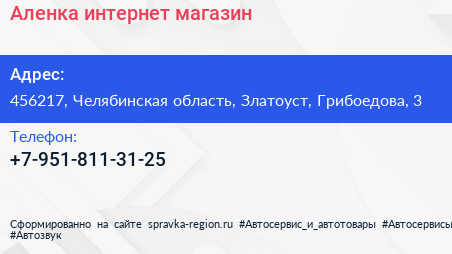 Аленка, интернет-магазин по адресу 456217, Челябинская область, Златоуст, Грибоедова, 3 в дальнейшем Организация, размещена в следующих категориях: