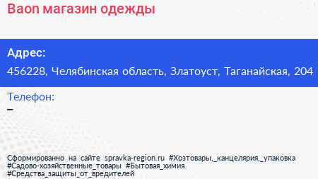 Baon, магазин одежды по адресу 456228, Челябинская область, Златоуст, Таганайская, 204 в дальнейшем Организация, размещена в следующих категориях: