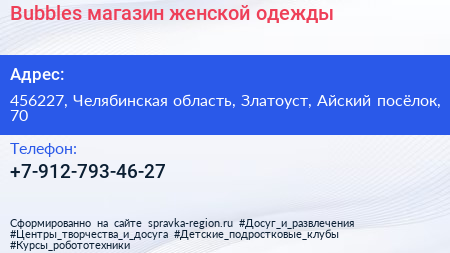 Bubbles, магазин женской одежды по адресу 456227, Челябинская область, Златоуст, Айский посёлок, 70 в дальнейшем Организация, размещена в следующих категориях: