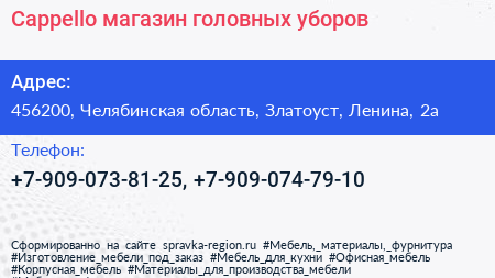 Cappello, магазин головных уборов по адресу 456200, Челябинская область, Златоуст, Ленина, 2а в дальнейшем Организация, размещена в следующих категориях: