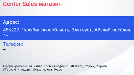 Center Sales, магазин по адресу 456227, Челябинская область, Златоуст, Айский посёлок, 70 в дальнейшем Организация, размещена в следующих категориях: