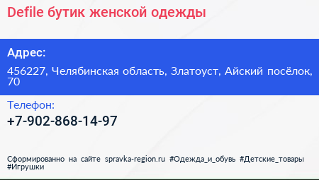 Defile, бутик женской одежды по адресу 456227, Челябинская область, Златоуст, Айский посёлок, 70 в дальнейшем Организация, размещена в следующих категориях: