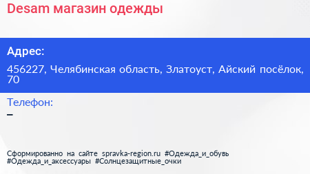 Desam, магазин одежды по адресу 456227, Челябинская область, Златоуст, Айский посёлок, 70 в дальнейшем Организация, размещена в следующих категориях: