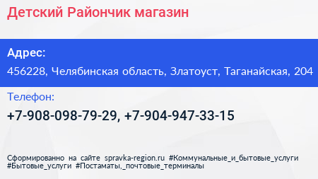 Детский Райончик, магазин по адресу 456228, Челябинская область, Златоуст, Таганайская, 204 в дальнейшем Организация, размещена в следующих категориях:
