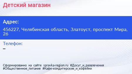 Детский магазин по адресу 456227, Челябинская область, Златоуст, проспект Мира, 26 в дальнейшем Организация, размещена в следующих категориях: