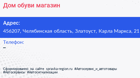 Дом обуви, магазин по адресу 456207, Челябинская область, Златоуст, Карла Маркса, 21 в дальнейшем Организация, размещена в следующих категориях: