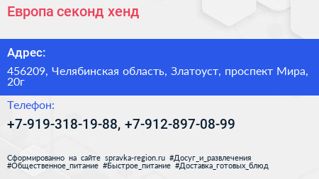 Европа, секонд-хенд по адресу 456209, Челябинская область, Златоуст, проспект Мира, 20г в дальнейшем Организация, размещена в следующих категориях: