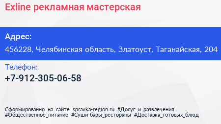 Exline, рекламная мастерская по адресу 456228, Челябинская область, Златоуст, Таганайская, 204 в дальнейшем Организация, размещена в следующих категориях: