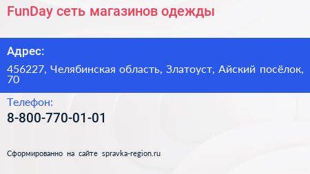 FunDay, сеть магазинов одежды по адресу 456227, Челябинская область, Златоуст, Айский посёлок, 70 в дальнейшем Организация, размещена в следующих категориях: