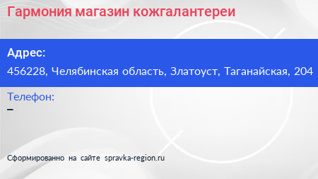 Гармония, магазин кожгалантереи по адресу 456228, Челябинская область, Златоуст, Таганайская, 204 в дальнейшем Организация, размещена в следующих категориях: